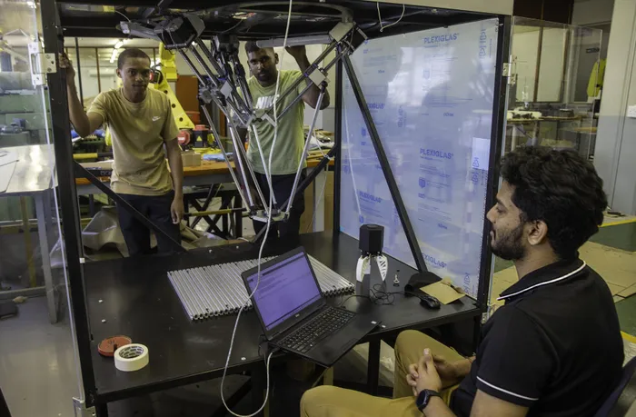 Prenavan Nayagar controls the Axis Prismatic–Spherical–Spherical Delta Robot, while his teammates Lusanda Siphephelo Phakathi, and Durand Moonsamy monitor it from the other side.