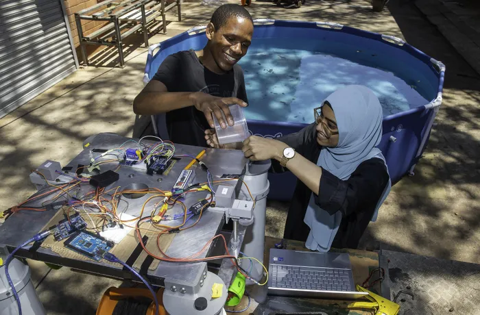 Andile Innocent Mncwabe and Azraa Mahomed Khan working on their floating rocket launch platform.