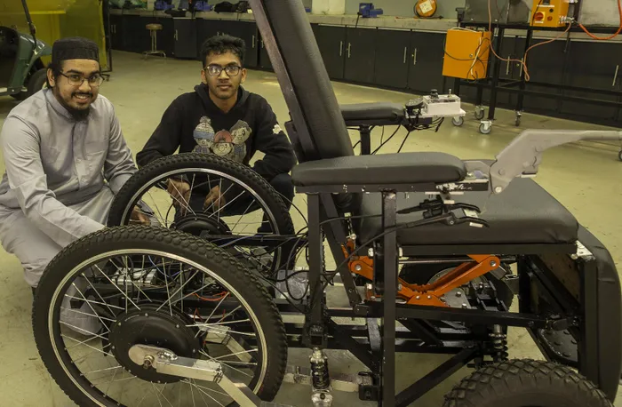 Muhammed Yusuf Ismail (left) and Ruchir Somaru built a wheelchair that can navigate rough terrain and be converted into a stretcher in emergencies.