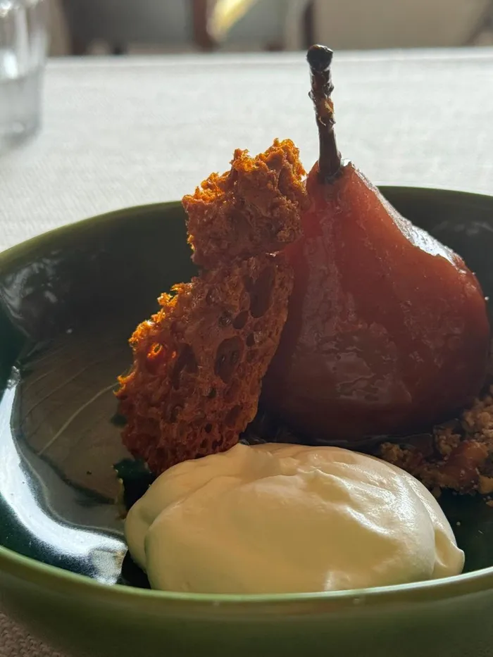 Poached pear with crème Chantilly, nuts and honeycomb.