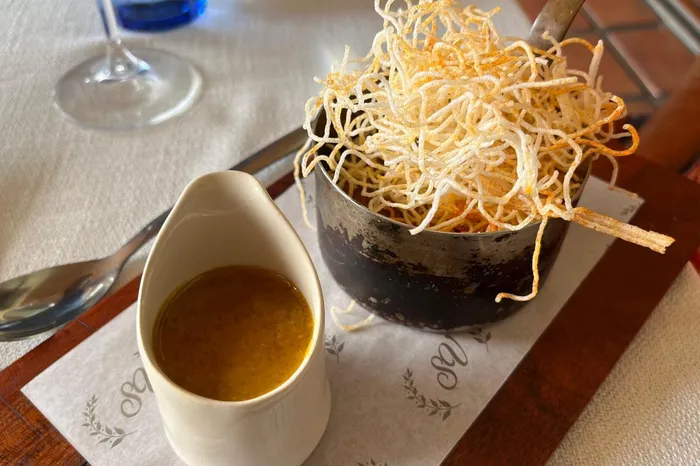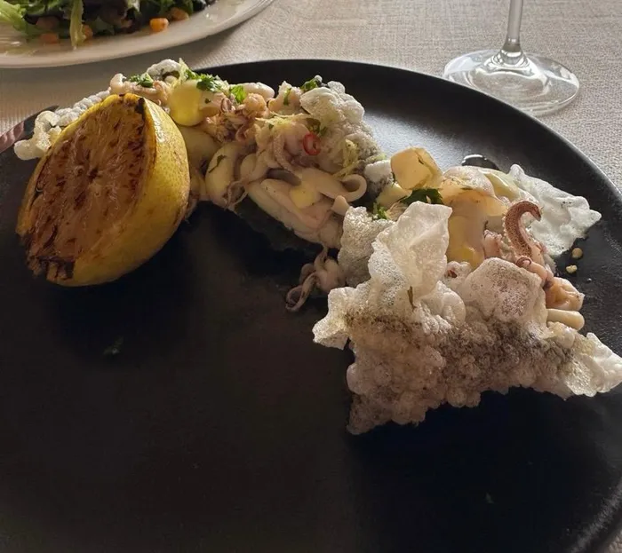 Then came starters. The leek soup with grilled shallots and green oil tempted while the exotic mushroom risotto suitably luxurious. The Orange Lady tried the grilled calamari on crispy seaweed with lemon aioli (R120), which not only looked so beautiful - almost like oysters - but that crispy seaweed, done in a light batter, really gave everything the flavour of the sea. It was a lovely fresh dish.