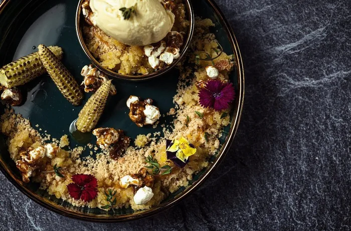 A celebration of corn... a dessert of mealie cake, sweetcorn ice-cream, popcorn in burnt caramel and corn infused with thyme.