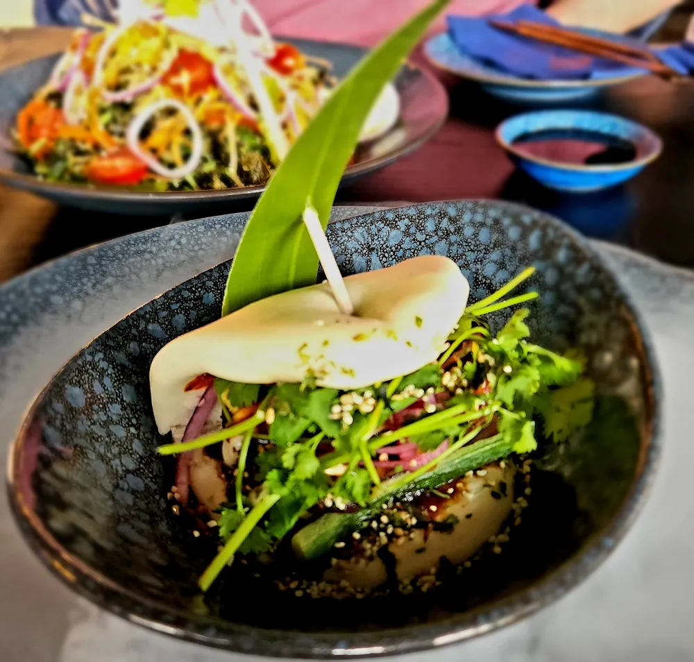 Crispy duck bao bun with the prawn and crispy kale salad in the background.