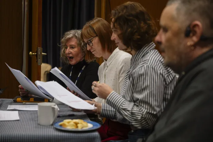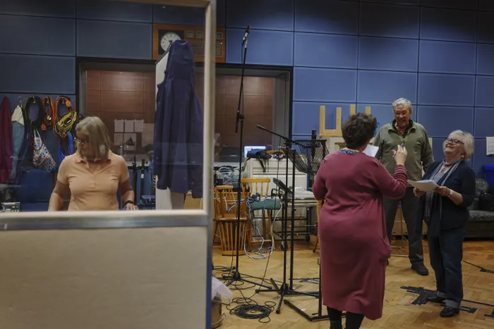 Members of "The Archers" crew — from left, Vanessa Nuttall, Kim Greengrass, Tim Bentinck and Sunny Ormonde — during rehearsals in a BBC studio in Birmingham this week.