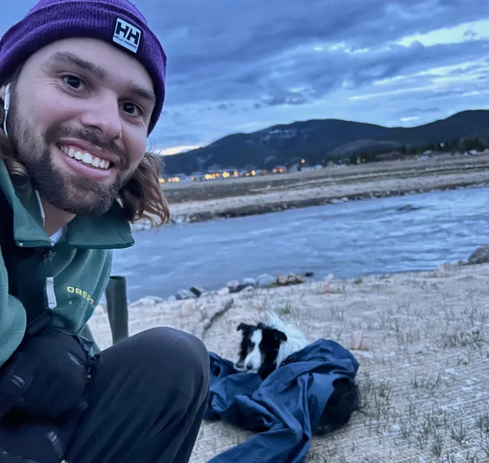 Picture of bearded young Zach Hackett crouched beside a river, a black and white dog lying beside him. Zach Hackett pauses to rest with Riley on May 14, before carrying him across Colorado's Blue River. Hackett found the dog near the top of a mountain. Picture: Zach Hackett