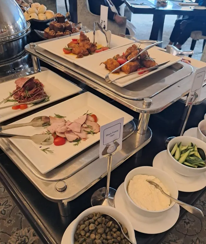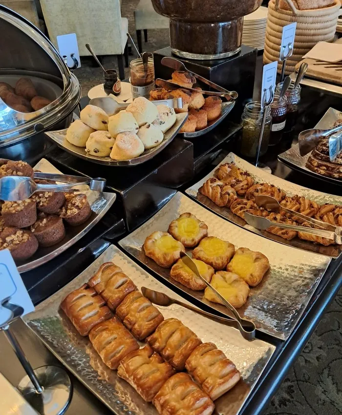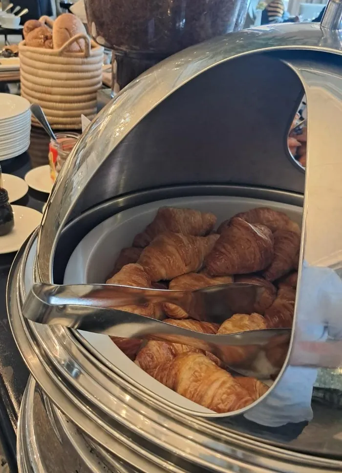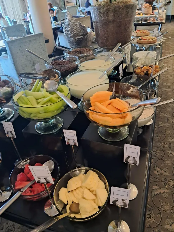 There’s a table laden with fresh cut fruit, stewed fruit, dried fruits and nuts and seeds and stuff, along with a selection of yoghurts, and pouring and whipped cream. And then there are cereals and mueslis. You can order oats porridge from the kitchen if you would like some. I must admit I’ve never quite understood why on a five-star buffet laden with many exciting options someone would want rice krispies for example. Maybe they just want to feel like they’re at home. And that said, I have fruit and yoghurt every morning at home, and guess where I went.