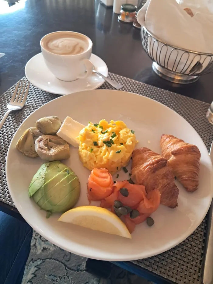 Scrambled eggs and smoked salmon on croissants with avo, cream cheese artichokes and capers.