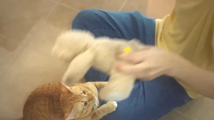 Look at the pictures and decide: is the cat feeling positive or negative about the interaction? Remember to base your answers only on the cat’s behaviour. Answer: Negative. This cat is showing signs of stress. The ears are flat and to the side, brow is furrowed, whiskers are stiff, they hiss, squint and flinch in anticipation of the toy coming near. The head is slightly tucked in and there is tension in the body.
