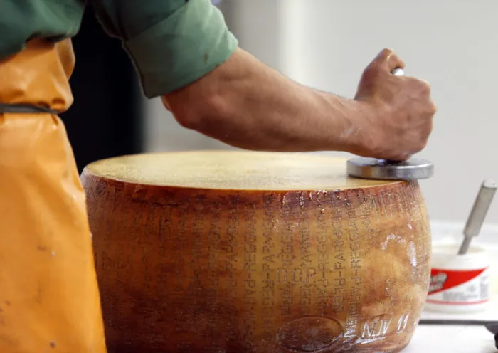 A man works on a Parmesan cheese wheel in Montecavolo, near Reggio Emila, central Italy. Italians say they are battleing against “Italian-sounding foods” like “parmesan cheese” as opposed to the real Parmigiano-Reggiano from Italy.