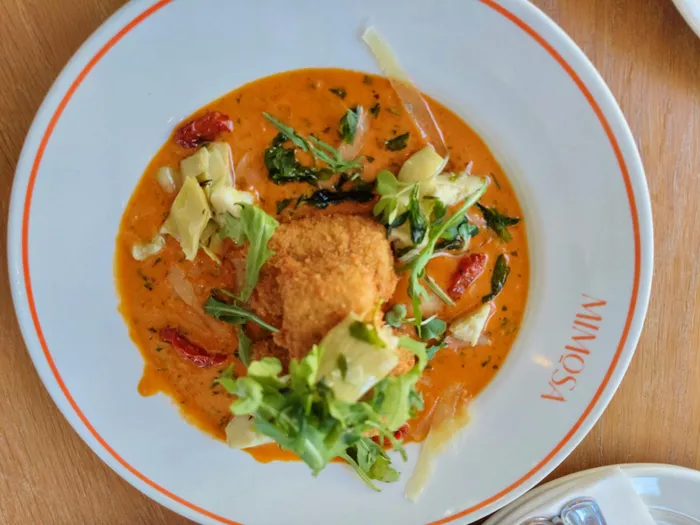 Pistachio and Parmesan aranchini balls in a tomato and paprika sauce.