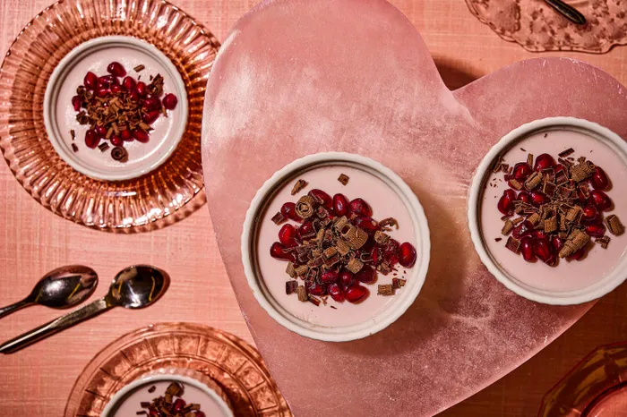 Served right in the ramekins - like an elegant pudding cup - and topped with juicy, gemlike pomegranate seeds and chocolate shavings, it’s a healthier dessert that’s ideal for Valentine’s Day or anytime you want to feel the love.