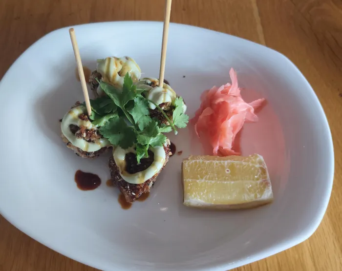Tuna lollipops with wasabi mayo and pickled ginger.