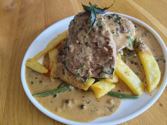 Peppered fillet with chips and roast veg.