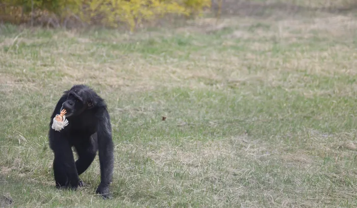 Foxie, a chimpanzee at Chimpanzee Sanctuary Northwest in Cle Elum, Washington, carries one of the hundreds of dolls she plays with at the sanctuary.