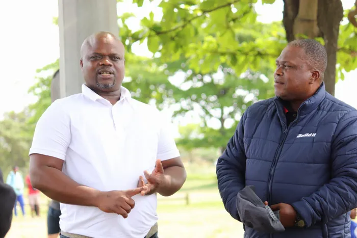 Umhlathuze Mayor Xolani Ngwezi in white T-Shirt and a community member.