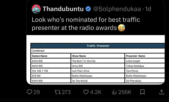 Sol Phenduka has earned a nomination for Best Traffic Presenter at the upcoming awards for his work on the Kaya 959 show, "Siz The World." This nomination is particularly notable as it comes after he departs from Kaya 959, recognizing his contribution in the specific role he held on the show.
