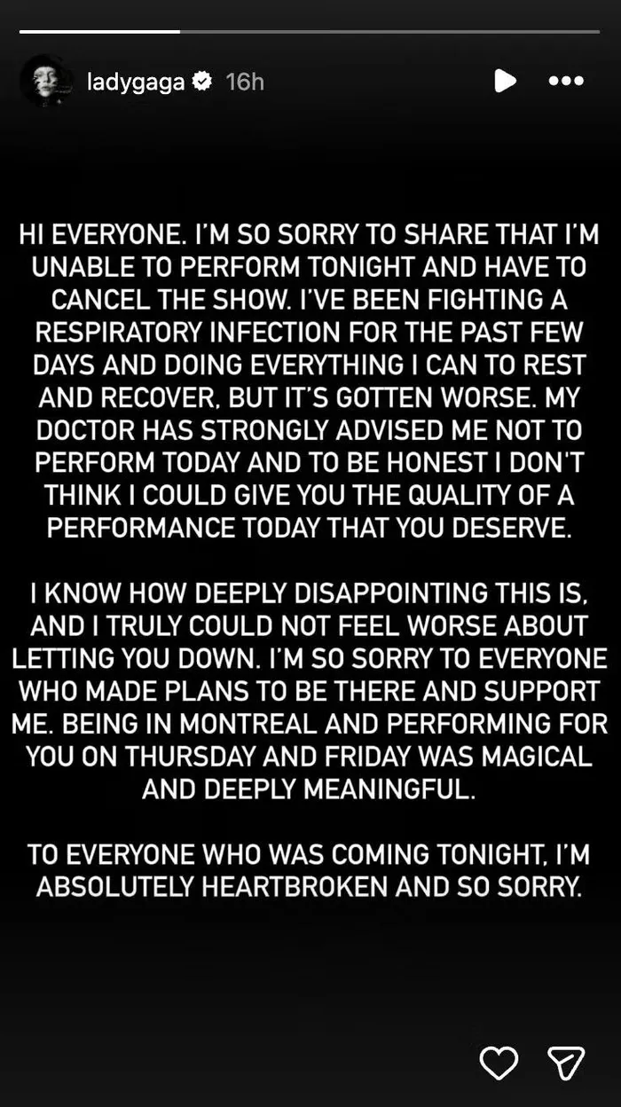 Lady Gaga shared the news of her cancelled Montréal concert on Instagram just hours before the show.