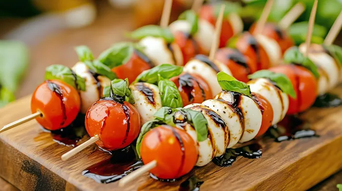 Caprese skewers: Thread cherry tomatoes, baby mozzarella balls, and fresh basil onto small sticks. A quick drizzle of balsamic glaze and a pinch of sea salt transform these into a vibrant, gourmet bite.