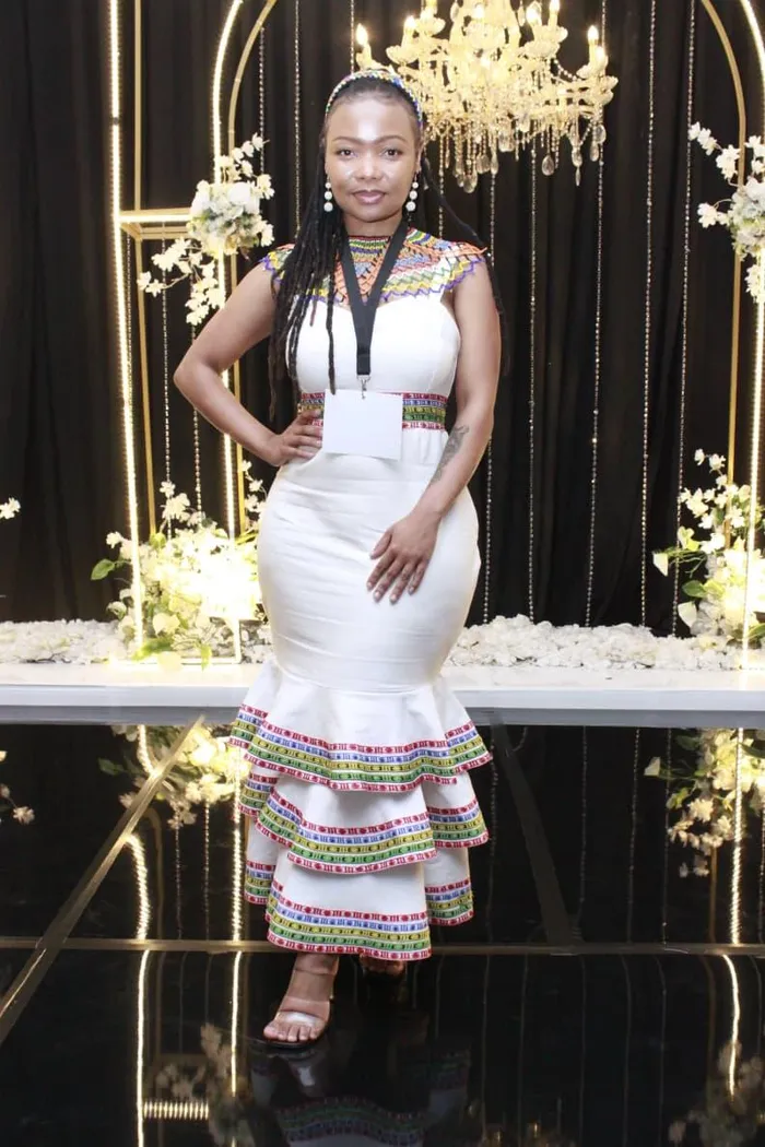 She accessorised with beaded jewellery in the colours of Mpondo culture, stating, “These are usually the colours you will find eMaMpondweni. If you look at my dress, this is how we usually pair the colours and designs. We do love our colours.”