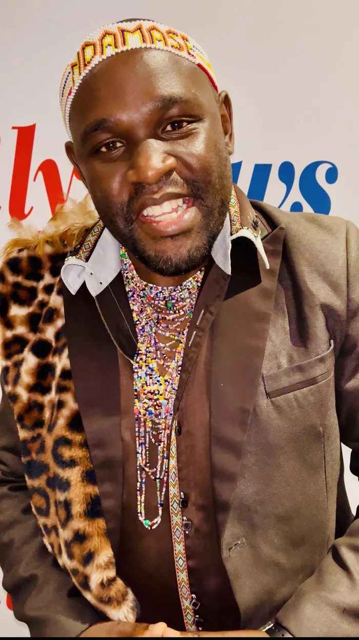 Prince Zukisani Ndamase of the Mpondo Kingdom wore a chocolate brown suit adorned with traditional accessories, including a beaded headband inscribed with his family name and a leopard print shoulder scarf, symbolising royalty.