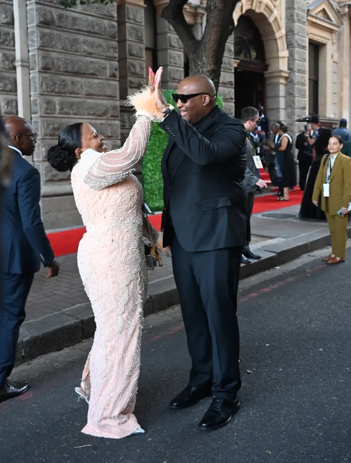 Meanwhile, Thami Dish, activist and founder of the Feather Awards, served an all-white ensemble - gown meets suit - with an open-shoulder twist and a matching hat. The whole vibe screamed royal wedding energy, and we were totes here for it.
