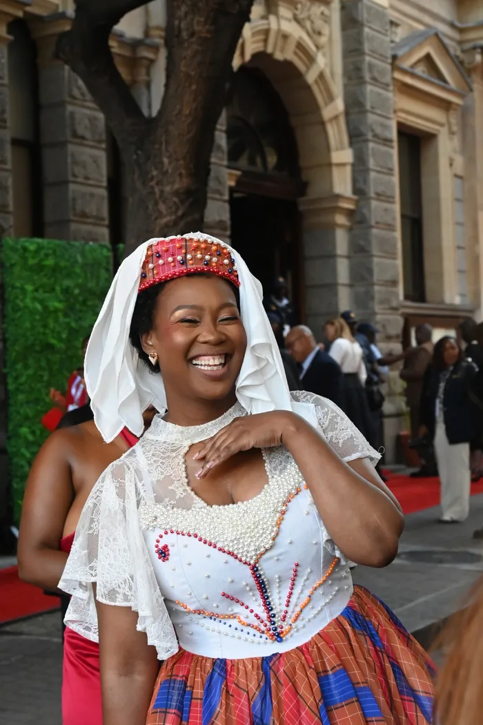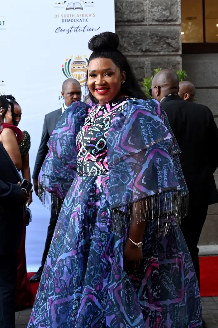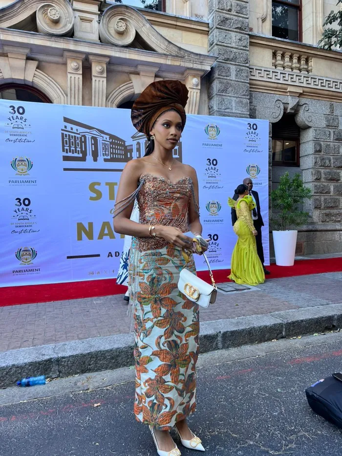 Nobukhosi Mukwevho, the creative director and the founder of the women’s fashion brand Khosi Nkosi, on the Sona 2026 red carpet.