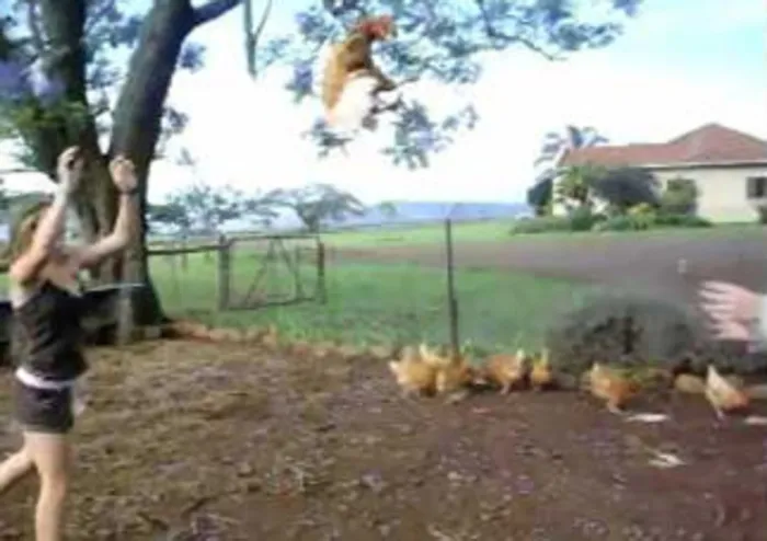 The video footage depicts the hen trying to fly, but it lands head first after one of the throws.