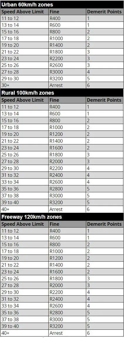 The same pattern applies to freeway driving, with 131-132km/h earning a R400 fine and 159-160km/h bringing the total to R3,200, with five penalty points.