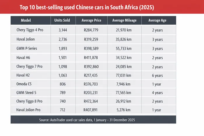 These are the 10 best-selling used Chinese vehicles in South Africa for 2025.