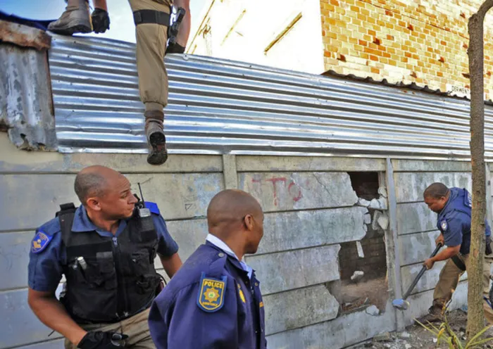 Cape Town - 111214 - A metro police officer jumps over a wall at a Derwent Court flat while another breaks down the vibracrete wall. 48 bags of tik were found inside and one man was arrested during a Drug Raid conducted by the Metro Police Dog Unit as part of their Festive Season readiness campaign. Three people were arrested for Tik. - Photo: Matthew Jordaan Cape Town - 111214 - A metro police officer jumps over a wall at a Derwent Court flat while another breaks down the vibracrete wall. 48 bags of tik were found inside and one man was arrested during a Drug Raid conducted by the Metro Police Dog Unit as part of their Festive Season readiness campaign. Three people were arrested for Tik. - Photo: Matthew Jordaan