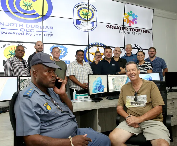 Resourced and ready, Durban North police station commander Colonel Jericho Nkomo takes a call in the new operations community centre established in the suburb and neighbouring Greenwood Park. Seated with him is Terry Goulding, vice-chair of the Durban North Community Policing Forum (CPF), who will run the centre. Behind them, from left, are Glen Naidoo of Global Networks; Darryl Oliver, the CPF’s public relations officer; Bruce Taylor of the CPF and in charge of neighbourhood watches; Clive Samuels, regional director of Blue Security; Bronwynne Venter of the CPF and the Greater Together Foundation; Tristan Hiestermann of Marshall Security; Hayden Searles CPF chairman; Murray Smith, CEO of the Greater Together Foundation; councillor Nicole Bolman and Chris Fraser, director of the Greater Together Foundation. Picture: Shelley Kjonstad/ Africa News Agency (ANA)
