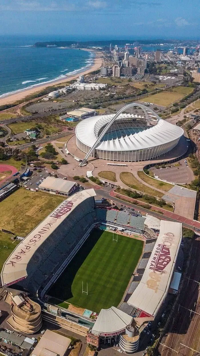 Kings Park Stadium in about 2020 with the impressive Moses Mabhida Stadium behind it.