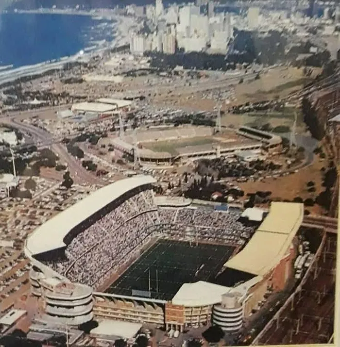 Kings Park Rugby stadium with kings Park soccer stadium in the background, probably shot in the late 90s, after the renovations for the 1995 World Cup.