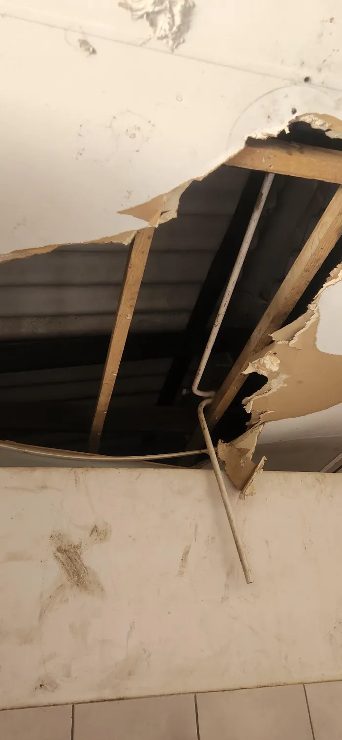 In one bathroom, painted bright green, part of the ceiling had collapsed, exposing corrugated roofing and wooden supports.
