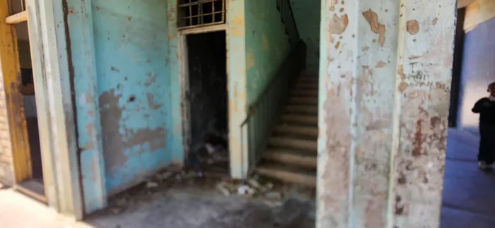 The rest of the building showed deep decay, with rusted and broken window frames — one held together with a piece of cloth where a pane had gone missing.