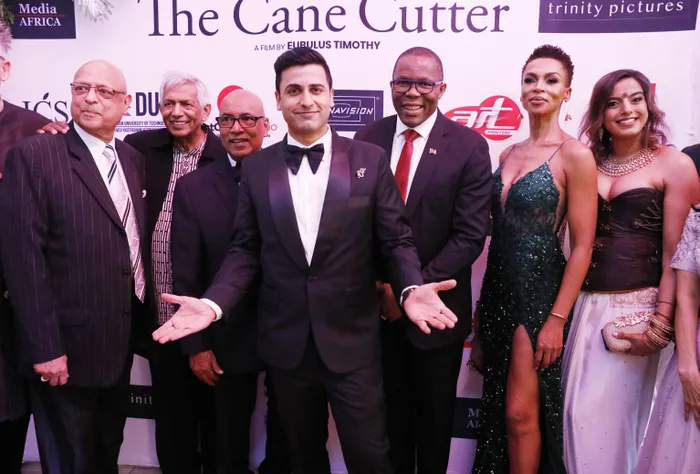 The Cane Cutter, a feature film, premiered in Durban this week. Razeen Dada, centre, plays the lead role of Dev, a law school dropout turned filmmaker. Here he is accompanied by members of the production team, cast members and guests.
