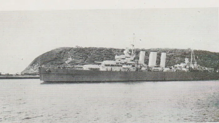 HMAS Australia, the flagship of the fledgling Australian navy leaving the port of Durban probably during World War 1.
