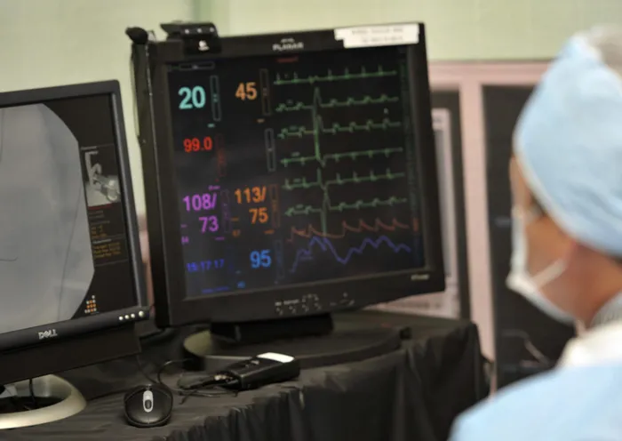 A doctor watches a monitor as he inserts a stent into an artery during a cardiology simulation.