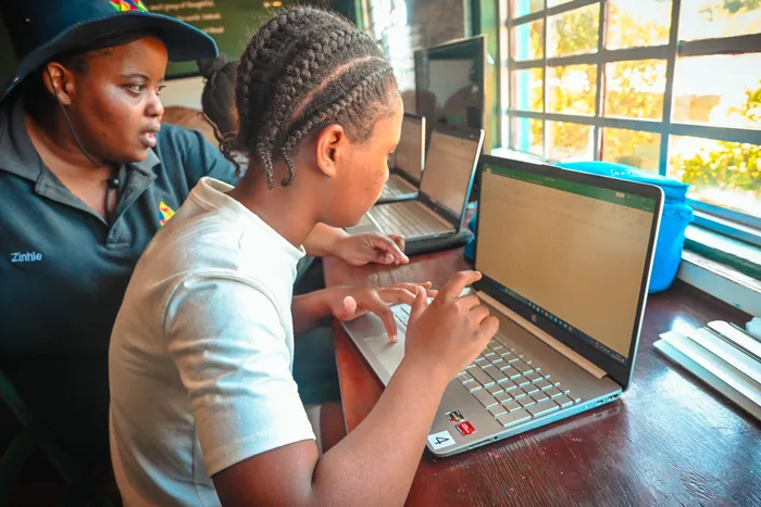 Thanda facilitator and mentor Zinhle helps pupils as they develop essential digital skills during computer lessons in the Grade 8+ Skills Programme.