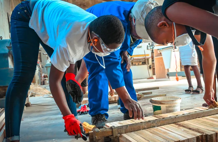 Community mentor Bernard leads a carpentry session with pupils in Thanda’s Grade 8+ Skills Programme teaching foundational woodworking skills.