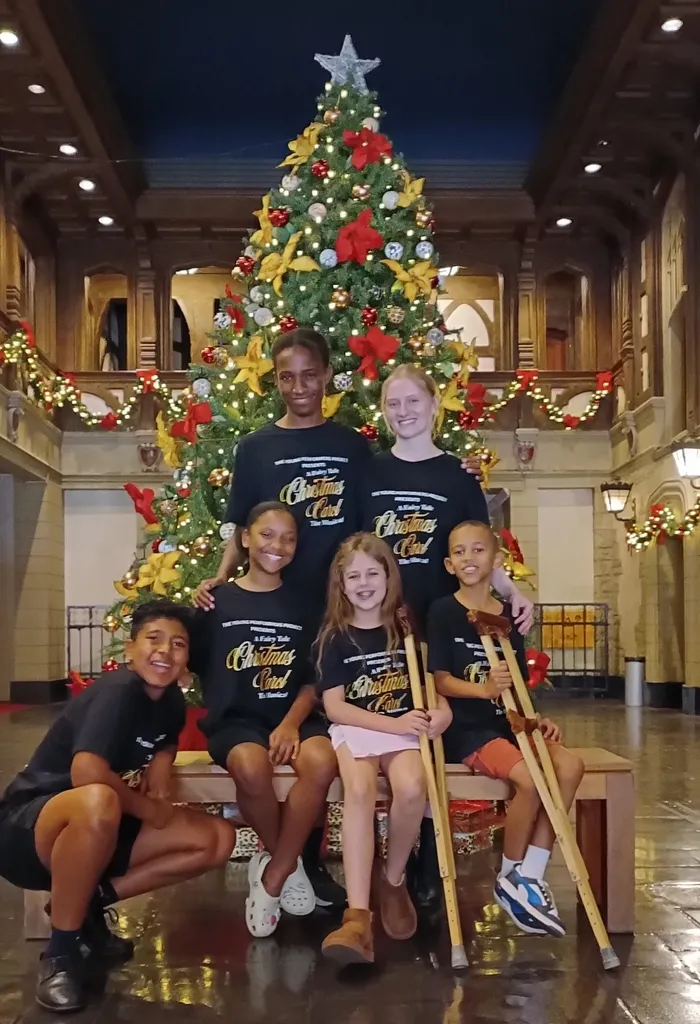 The Pratchett Family from A Fairy Tale Christmas Carol: The Musical, gather in front of the Playhouse Christmas tree. Front left to right:Noah Bassa, Larke Manto, Mackenzie Judge, Makhai Bennett. Behind Mzwakhe Bultitude and Jenna Van Eyssen.
