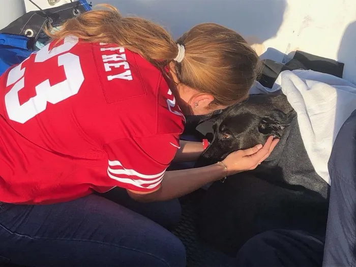 Alexis Barcellos reuniting with her dog Sadie after the pet was rescued.