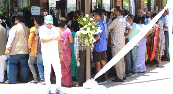 Mourners gather for the funeral service of New Ahobilam Temple of Protection founder Vick Panday (52) and Food For Love Africa cook Vasudeva Datta Das (65) at the River Range Ranch in Verulam.
