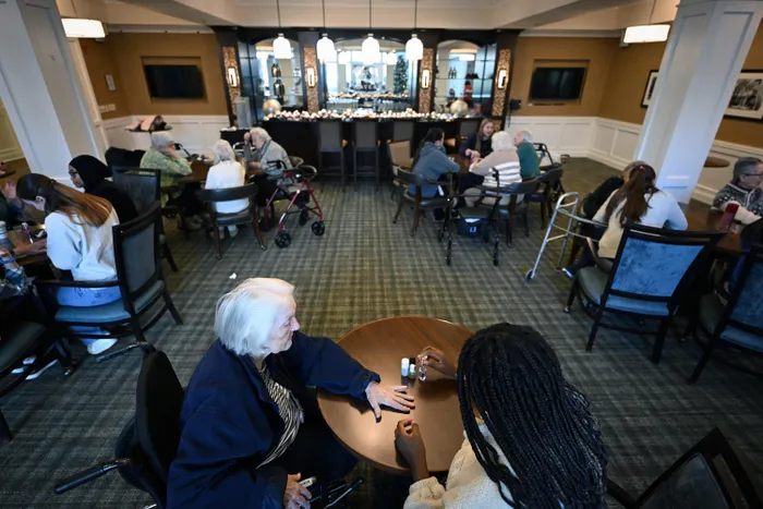 Next, Ellis and Workman joined a table of women, each with a rolling walker parked behind her, to play the card game Kings in the Corner, which is typically how they pass the days.