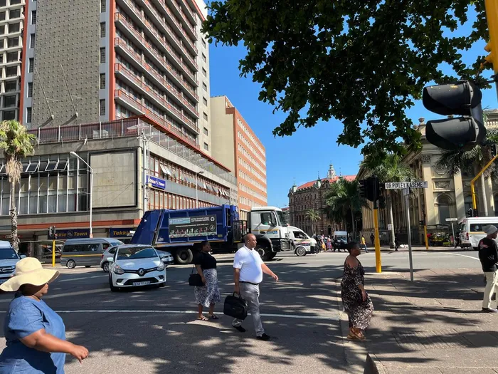 The scene today, shot from the other side of the road so one could get the station in in the background. On the left is the modern high rise that replaced the Natal Bank Building and on the right the old town hall, now the Post Office.