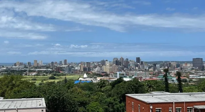 The trees in the foreground are the city's Botannic Gardens and the fields at Currie's Fountain can clearly be seen on the right. The two turrets in the foreground are of St Aidan Church attached to the hospital and the building's in front of them part of the old ML Sultan technical college, today part of the Durban University of Technology.