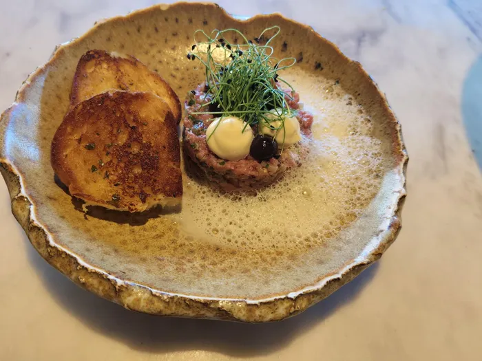 Beef tartare with smoked yolk and garlic bread.