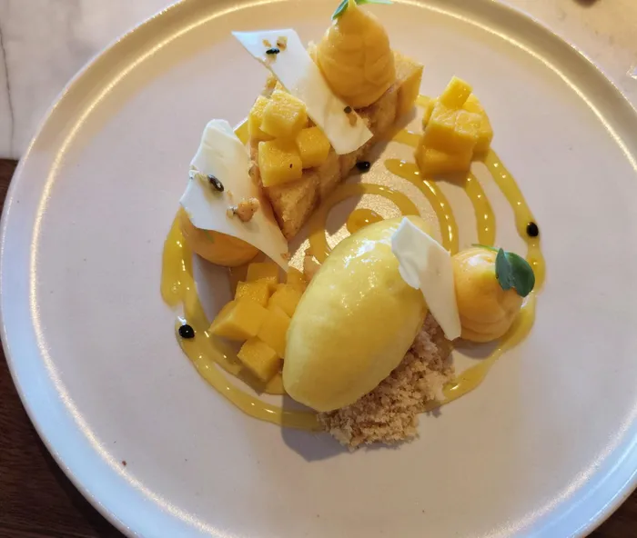 The Fat Frog lady had to leave us before dessert - it was a work day afterall. I enjoyed what was probably best described as a chocolate and hazelnut parfait (R130) which was more like an ice-cream sandwich layered with hazelnut ice-cream, hazelnut mousse and chocolate mousse under a dome of gold dusted dark chocolate. Ingrid enjoyed a taste of the tropics with a dish which was an ode to many different treatments of mango along with a passion fruit custard (R120).