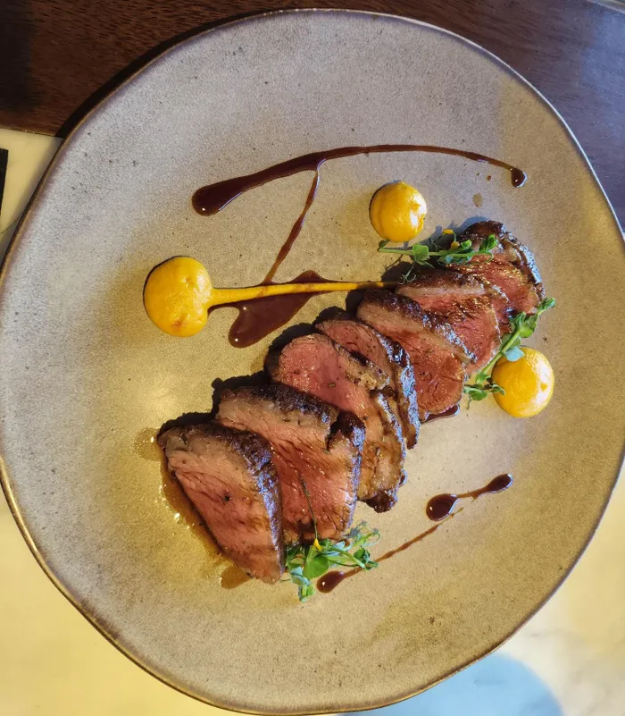 Mains might include coal roasted turkey with whipped potato, cranberry compote, crispy kale, and bourbon jus or a Midlands beef tasting of smoked short-rib, fillet, confit dumpling, carrot and cardamom jus. I was tempted. There’s an interesting take on fish and chips, and karoo lamb featuring shoulder and loin. Pork rack, blesbok loin and yellowfin tuna are options. There’s even a masala cauliflower with strained yoghurt, mint, sultanas, pickled red cabbage and sev.