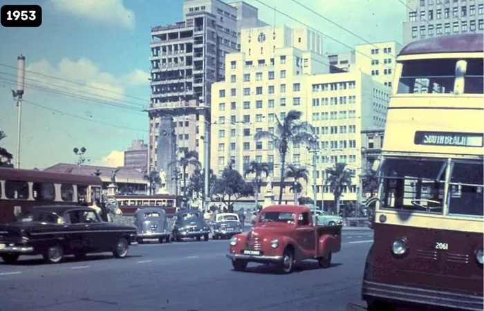 The Cenotaph which was built in 1926 to commemorate the city’s fallen in World War 1 can be seen behind them. The multi-storey building on the corner of Smith, today Anton Lembede, and Gardiner is clearly still under construction. The Art Deco fronts of the other highrises would clearly have been regarded as thoroughly modern in 1953.